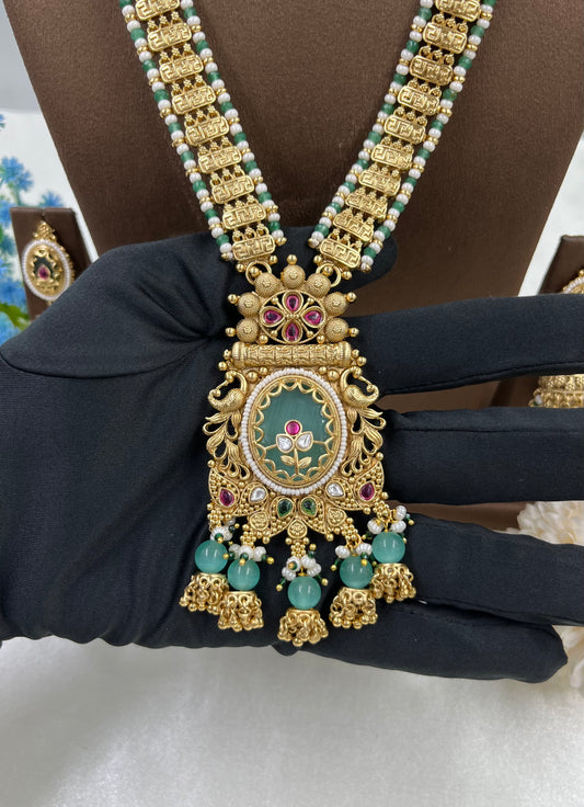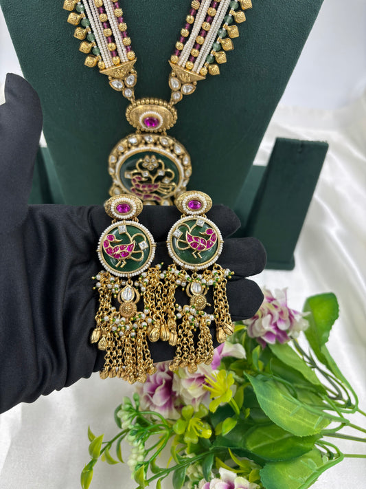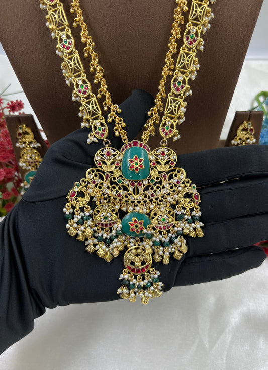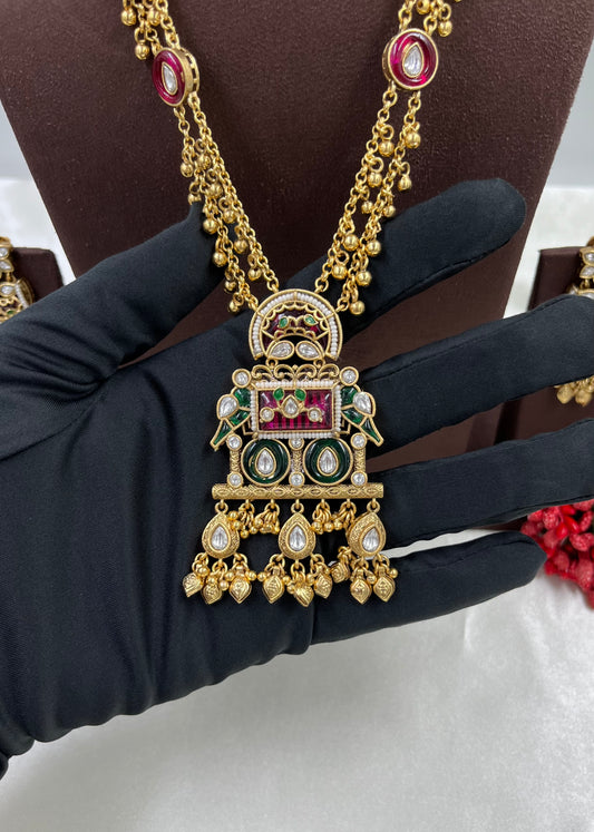 HANVI PREMIUM LONG ANTIQUE GOLD NECKLACE SET.